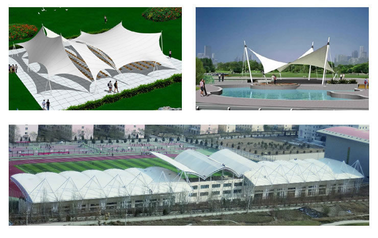 膜結(jié)構(gòu)所用膜材料由基布和涂層兩部分組成.基布主要采用聚酯纖維和玻璃纖維材料;涂層材料主要聚氯乙烯和聚四氟乙烯。常用膜材為聚酯纖維覆聚氯乙烯(PVC)和玻璃纖維覆聚聚四氟乙烯(Teflon)。PVC材料的主要特點(diǎn)是強(qiáng)度低、彈性大、易老化、徐變大、自潔性差,但價(jià)格便宜,容易加工制作,色彩豐富,抗折疊性能好。為改善其性能,可在其表面涂一層聚四氟乙烯涂層,提高其抗老化和自潔能力,其壽命可達(dá)到15年左右。Teflon材料強(qiáng)度高、彈性模量大、自潔、耐久耐火等性能好,但它價(jià)格較貴,不易折疊,對(duì)裁剪制作精度要求較高,壽命一般在30年以上,適用于***建筑。